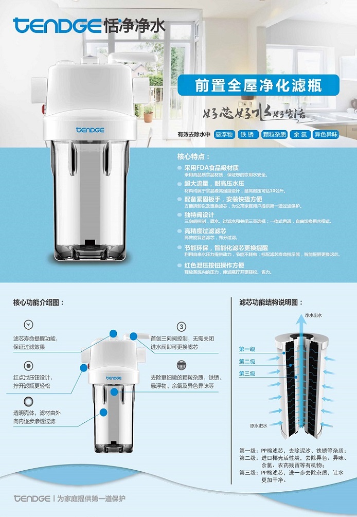 恬凈前置全屋凈化濾瓶TQ-P2能有效去除水中的懸浮物、鐵銹、顆粒雜質(zhì)、余氯、異色異味,它采用FDA食品級(jí)材質(zhì),高精度過(guò)濾濾芯,體積小巧,安裝方便。恬凈前置全屋凈化濾瓶TQ-P2能承受高水壓,流量超大,智能濾芯提醒功能,節(jié)能環(huán)保。