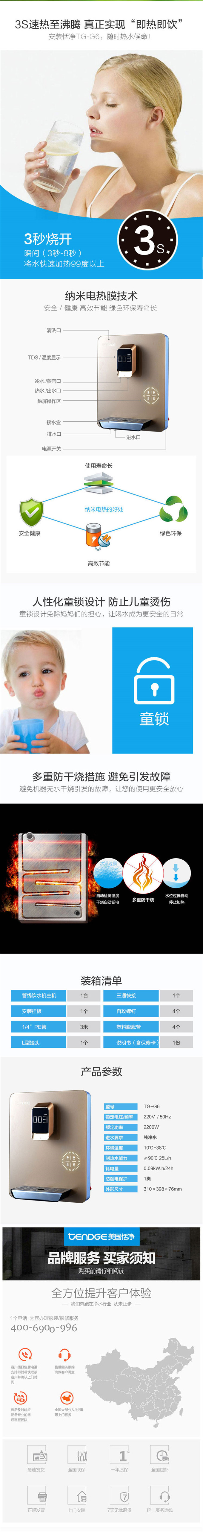 恬凈速熱管線飲水機(jī)TG-G6,采用納米電熱膜加熱技術(shù),有效殺死水中的細(xì)菌微生物,防治二次污染。3秒速熱,隨時(shí)可喝上熱水。恬凈速熱管線飲水機(jī)TG-G6自帶防干燒系統(tǒng)與童鎖,安全省心。
